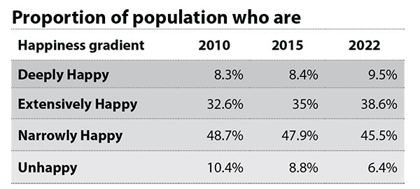The percentage of individuals falling into the “deeply” and “extensively” happy categories increased by 7.2 percentage points from 2010 to 2022, demonstrating an upward trend in overall happiness.