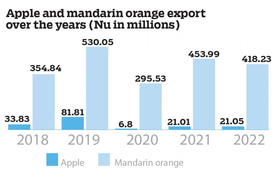 At the same time, Nu 21.05M worth of apples were exported to India and other countries in 2022.