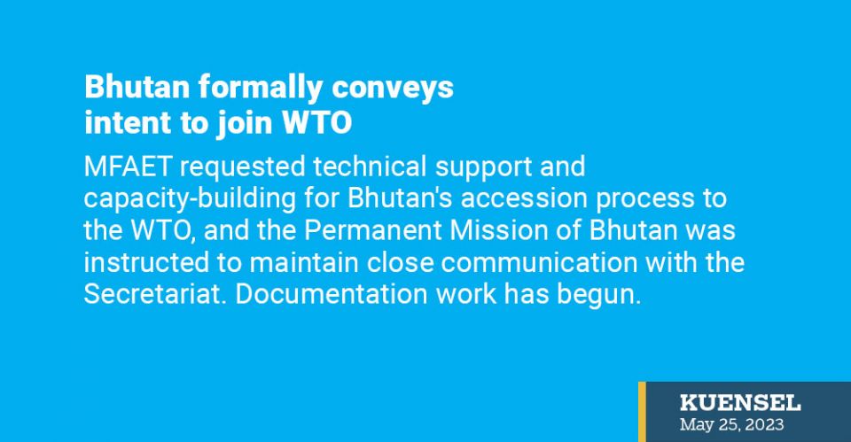 The Ministry of Foreign Affairs and External Trade (MFAET) sent a formal communication to the World Trade Organisation (WTO) Secretariat in Geneva in April end expressing Bhutan’s desire to join the organisation.
