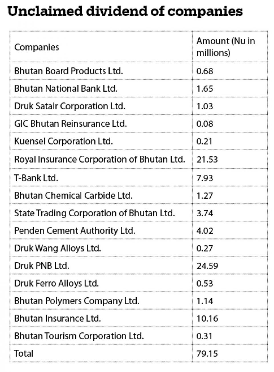 The Royal Securities Exchange of Bhutan (RSEB) has recently discovered Nu 79.15 million in unclaimed dividends from 16 out of the 19 listed companies. These unclaimed dividends have accumulated over time.