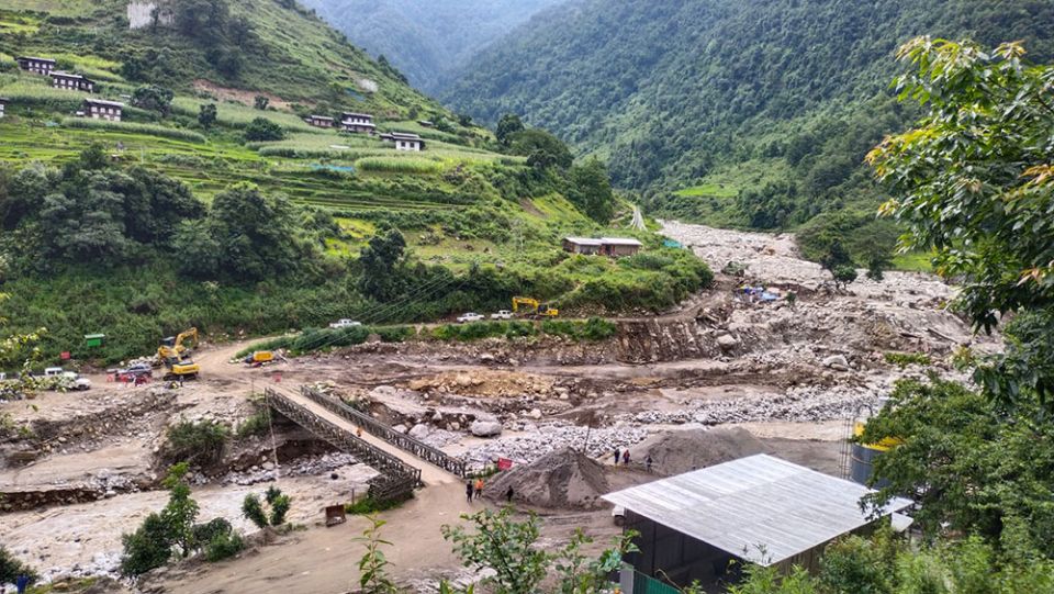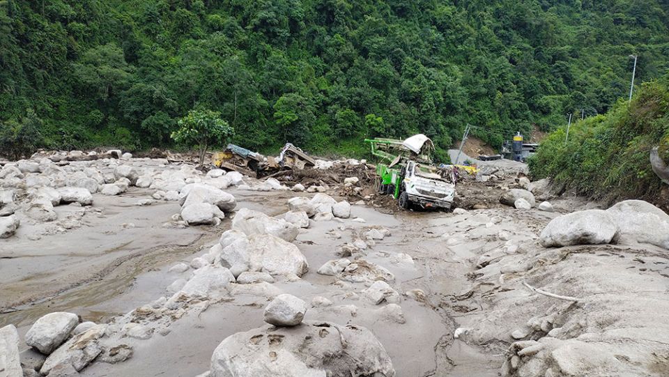 When day broke yesterday, a rescue team of local de-suups, workers of Rigsar Construction and local leaders saw the aftermath of the disaster and watched the extent of damage the flood left behind in disbelief. The flood swept away the entire camps and buried several vehicles including excavators.