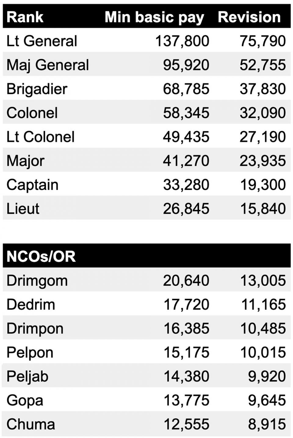 Under the non-commissioned officers (NCOs) category, Chuma personnel which is the lowest rank, their basic salary is Nu 12,555 a month and the total revision from pay reform 2022 and this year revision is Nu 8,915. Their gross salary would be more than Nu 30,000 a month including various allowances.